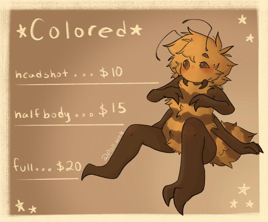𖦹 colored: headshot ($10), half ($15), full ($20)